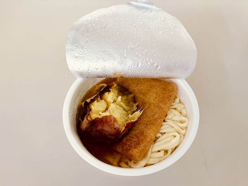 冷凍庫から出したおいもを温め、隣には熱々の「どん兵衛 きつねうどん」。