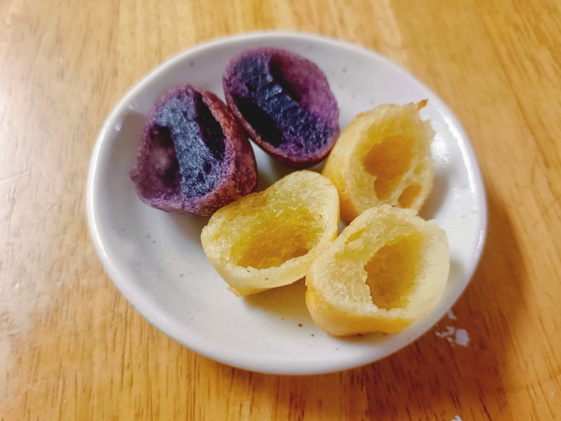 今回はしっとり甘い「紅はるか」と、鮮やかな紫色の「ふくむらさき」の2種類を使いました 。